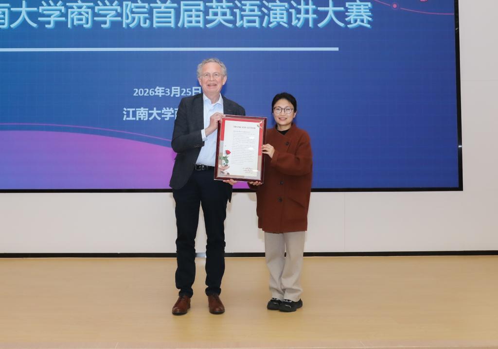 以声为翼,奔赴寰宇之约;以言为桥,对话世界舞台。3月25日,江南大学商学院举办首届“商才杯”英语演讲大赛。大赛旨在营造浓厚的校园英语文化氛围,着力提升商科学子的英语应用能力。本次大赛共有来自MBA、大数据管理与应用、金融学、数字经济、工商管理(中外合作办学)等专业的10名本科及硕士学生参与。学院党委副书记兼副院长郑丹丹出席活动。商学院客座教授Frans Greidanus、外国语学院教授龚晓斌、新东方前途出国资深导师曾漪与王沈嘉、商学院国际交流秘书刘舒皎担任大赛评委。大赛由大数据国际2502班朱昱桥和数字经济2501班余凌萱主持。