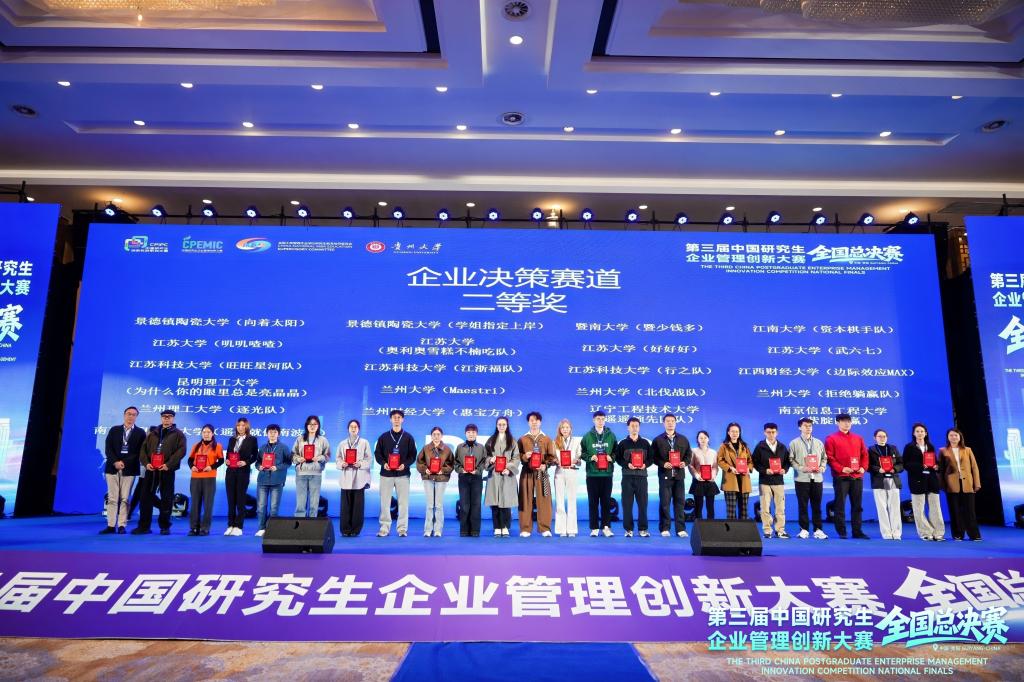 11月7日至9日,第三届(2025)中国研究生企业管理创新大赛全国总决赛在贵阳举行,共有来自全国150所高校的411支队伍晋级全国总决赛。由江南大学商学院在读研究生组成的三支队伍在总决赛中取得佳绩,其中数维破界者队和经纬纵横队获得工商管理案例赛道二等奖,资本棋手队获得企业决策赛道二等奖,江南大学获得优秀组织奖。