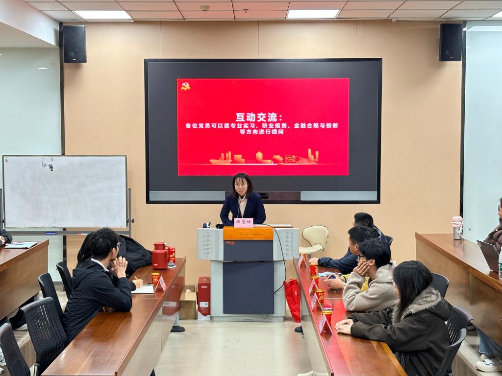 3月26日下午,商学院研究生经济学科第一党支部与管理学科第一党支部联合举办“党建引领金融实践·赋能经济学科成长”主题支部共建交流活动。活动邀请财通证券无锡营业部总经理李天松、合规岗陈慧姝、支持岗胡坚强、财顾岗张佳涛、商学院实习生于跃莅临分享。商学院党建工作辅导员孙旭媛及全体25级研究生党员参加,以党建为纽带,搭建校企交流平台,助力学子夯实金融知识、明晰职业方向。