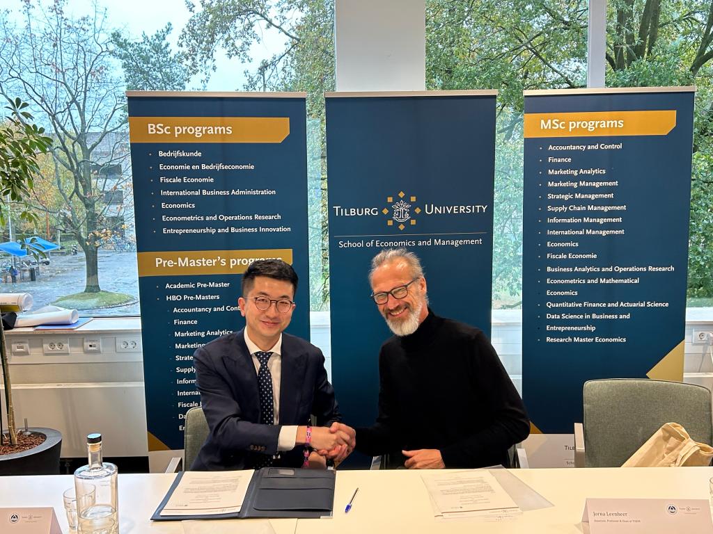 在蒂尔堡大学经济管理学院,主管国际事务副院长Jorna Leenhee、主管教育副院长Herbert Hamers、商业信息系统Carol Ou教授、Zilin He副教授、Joris Knoben教授、国际管理硕士项目学术主任Korhan Nazliben及国际处主任Wessel Meijer、Frans Greidanus教授与商学院一行开展座谈交流。双方聚焦“教育合作、学生交换、科研协同”的核心议题,就交换学生的选拔标准、学习期限、学分互认等关键问题进行细致磋商。会上,江南大学与蒂尔堡大学双方正式签署交换生协议,让两校在学生流动与国际化人才培养方面迈出坚实一步,为双方未来的深度合作奠定坚实的基础。
