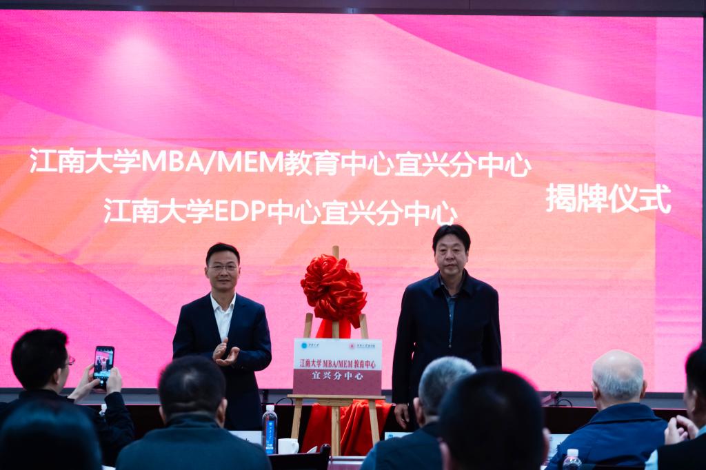 倪松涛和张达志一起为江南大学MBA/MEM教育中心、EDP中心宜兴分中心揭牌并表示祝贺。