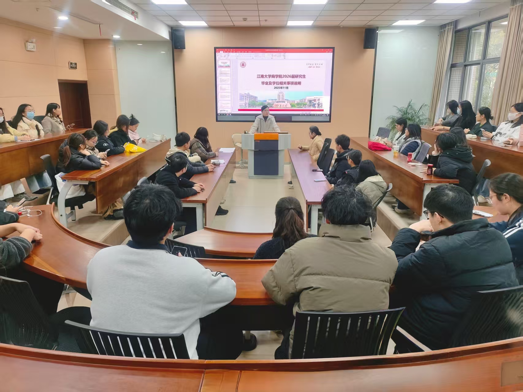 为持续推进研究生毕业就业进度,规范毕业生日常管理,12月23日下午,商学院在118会议室召开2026届研究生毕业就业工作宣讲会。研究生秘书胡文亮老师、雪浪派出所吴昀霖警官及全体2026届全日制研究生参加会议。宣讲会由分团委书记王璁主持。