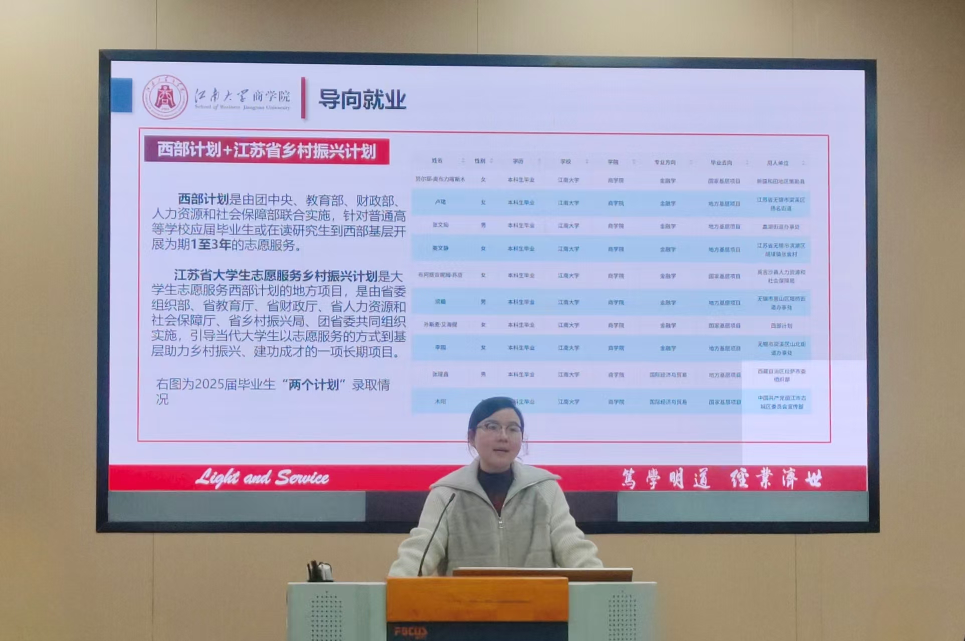 王璁对研究生毕业就业工作及日常管理规范进行动员宣讲。她围绕“两个计划”导向就业项目、就业推荐表及协议保管使用、就业签约解约流程及注意事项、寒假及春学期的就业服务安排等内容作细致讲解。同时她强调了日常管理规范、校园生活安全等,并逐一反馈前期收集的关于在就业进程和校内生活中存在的困难疑惑。