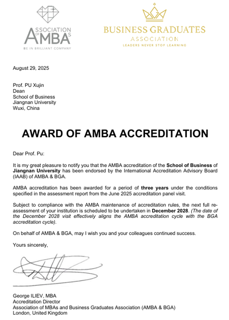 AMBA (Association of MBAs,英国工商管理硕士协会)成立于1967年,与AACSB(美国国际精英商学院协会)、EQUIS(欧洲质量发展认证体系)一起被公认为全球商学教育三大权威国际认证体系。AMBA是唯一仅针对MBA项目的国际认证体系,注重体现商务和管理实践的发展。江南大学商学院自2015年加入AMBA会员以来,先后于2018年首获认证、2021年通过AMBA&BGA联合认证、2024年完成BGA再认证,形成“认证-改进-提升”的良性循环机制。此次再认证过程中,专家组特别认可学院在“十五五”发展规划中展现的战略目标与行动方案,并对学院持续推进学科建设与国际化发展表达了积极期待。