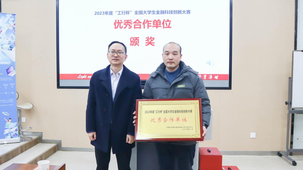 在热烈的掌声中,活动进入颁奖环节。蒋勇为江南大学商学院颁发“优秀合作单位奖”,高度认可商学院在2023年度“工行杯”竞赛组织工作中所取得的成绩。接着,无锡分行资深经理谢晓东为徐炜副教授颁发“无锡赛区优秀导师奖”,肯定其在指导学生参与“工行杯”竞赛中展现出的专业指导能力。随后,无锡分行金融科技部总经理丁珮瑾为上届大赛优秀参赛选手马一柠、钟妙清、张晨泽颁发“无锡赛区金融之星奖”,肯定了他们在比赛中展现出的创新才华与实践成果。