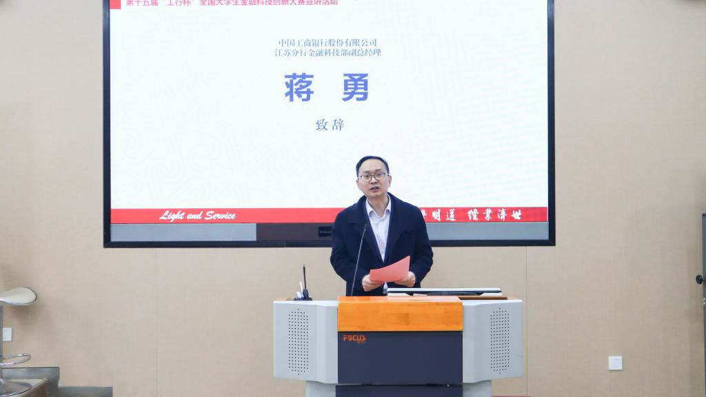 活动伊始,中国工商银行股份有限公司江苏分行金融科技部副总经理蒋勇致辞。他详细介绍了工商银行在金融科技领域的深厚底蕴与创新实践,强调了金融科技创新对于推动行业发展以及培养新时代复合型人才的重要意义。他表示,工商银行一直致力于携手高校,为广大学子搭建一个展示创新思维与实践能力的优质平台,期望同学们能够充分利用此次大赛机会,深入探索金融科技前沿领域,把在课堂中所汲取的理论知识巧妙地转化为能够切实落地生根、产生实际效能的创新实践产品,不仅在竞赛中磨砺自我,更能为金融科技领域的创新发展添砖加瓦,实现自身价值与行业进步的同频共振。