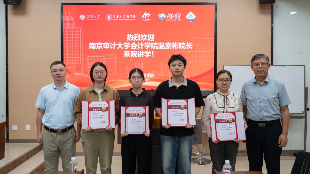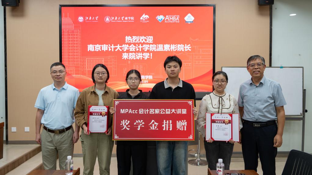 王雷介绍了“MPAcc会计名家公益大讲堂”的相关情况,表示该活动是由中国会计学会、全国会计专业学位研究生教育指导委员会共同发起的一项全国性公益活动,旨在充分发挥会计名家在引领和推动我国会计教育持续繁荣发展方面的重要作用,为MPAcc学员创造更多与会计知名学者交流和学习的机会,从而全面提升学员的综合素质。温素彬教授将本次讲座的全部课酬捐赠给江南大学商学院,用于设立“MPAcc会计名家公益大讲堂奖学金”,以资助成绩优异的MPAcc学员顺利完成学业。根据入学成绩排名,2025级全日制MPAcc学员李蓓、李彤、苏清扬和张宇欣4位新生同学荣获该项奖学金。