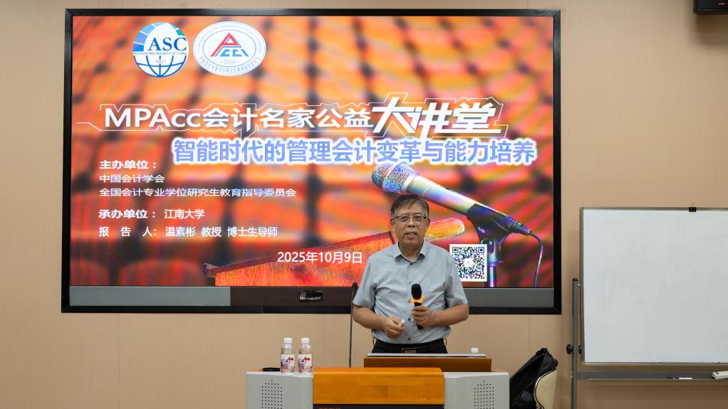 10月9日下午,由中国会计学会、全国会计专业学位研究生教育指导委员会主办,江南大学商学院承办的“MPAcc会计名家公益大讲堂”暨商学大讲堂系列学术讲座第277讲在商学院116东方厅举行。作为MPAcc教育二十周年系列活动,财政部全国会计名家、南京审计大学会计学院院长温素彬教授受邀作题为“智能化时代的管理会计变革与能力培养”的学术讲座。讲座由商学院副院长王雷教授主持,MPAcc行业导师及学院师生代表80余人参加本次讲座。