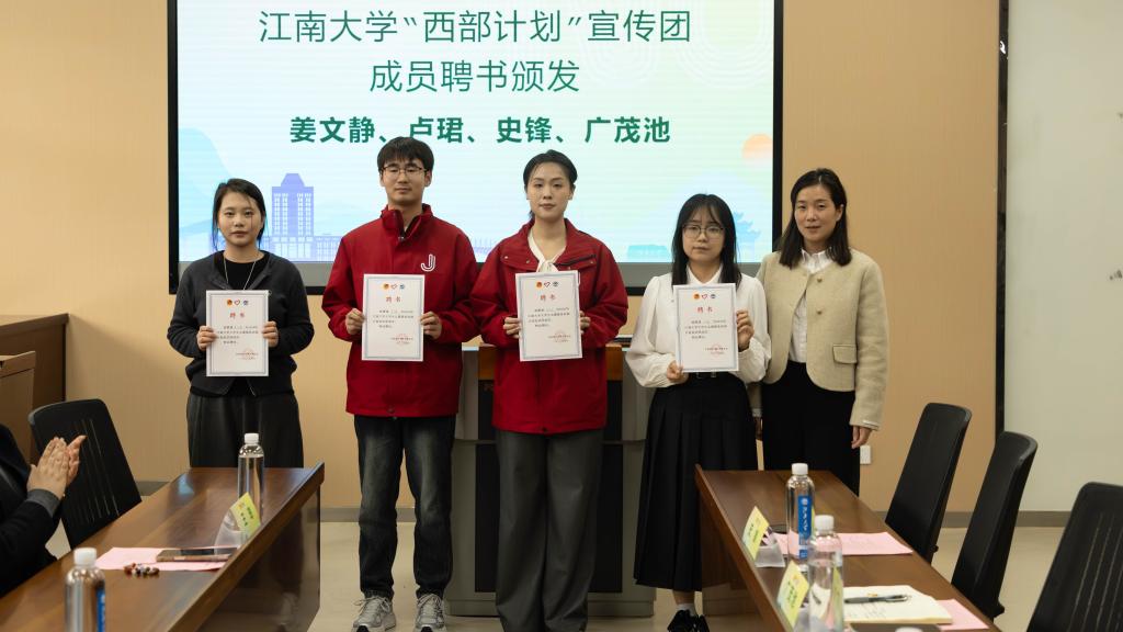 会上,王园园为江南大学西部计划宣传团成员颁发聘书。宣讲团成员为现场的同学们答疑解惑,就服务岗位选择、政策保障细节、报名流程等问题进行了深入交流。