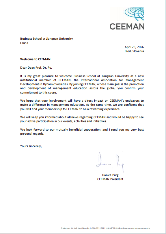 此次加入CEEMAN,是江南大学商学院国际化发展中的重要里程碑。学院将以此为契机,持续推动高水平商学院建设,努力培养具有全球视野和社会责任感的高素质管理人才。