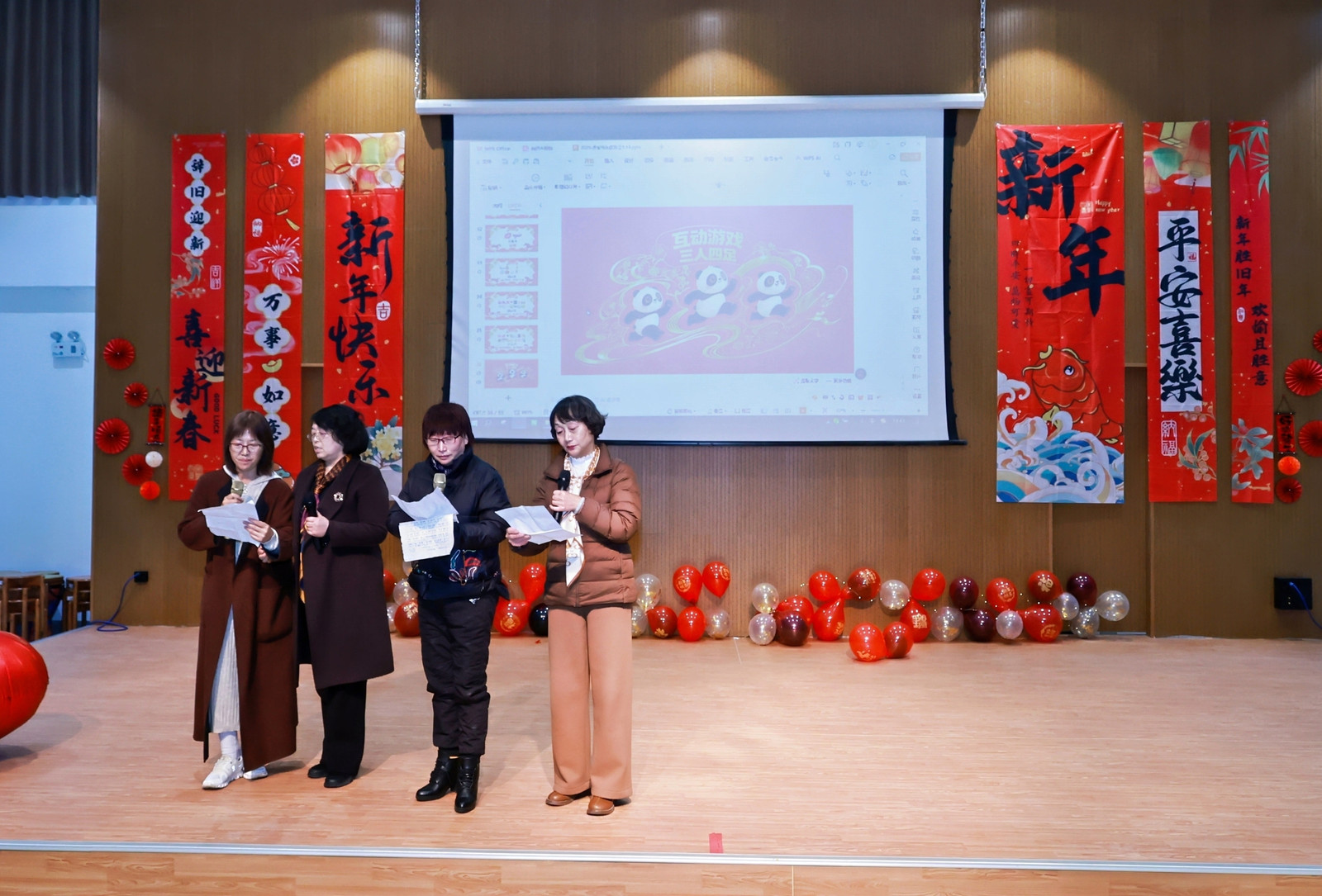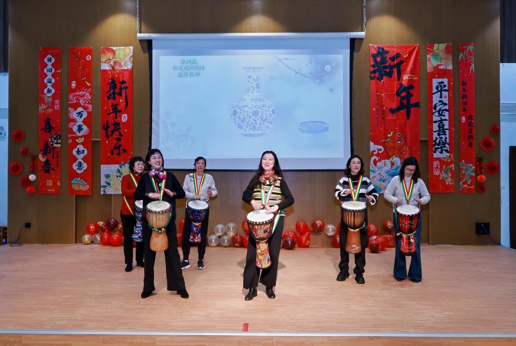 交流会后,退休教师们参加学院2026年教职工新春联欢会,并登台献艺。葛其春、唐方敏、唐红珍、张莉四位老师深情献唱《花又期》,用真挚醇厚的歌声勾起在场观众的深切共鸣。沈伟晔、邹丽敏、郑怀青、殷玲、孙敏、彭小静六位老师倾情演奏非洲鼓《你是我的期许》,以跃动的节奏与饱满的情感,展现出老有所乐、活力洋溢的精神风貌。他们的表演不仅传递出岁月沉淀下的从容与热爱,更生动呼应了联欢会“薪火相传”的美好寓意。