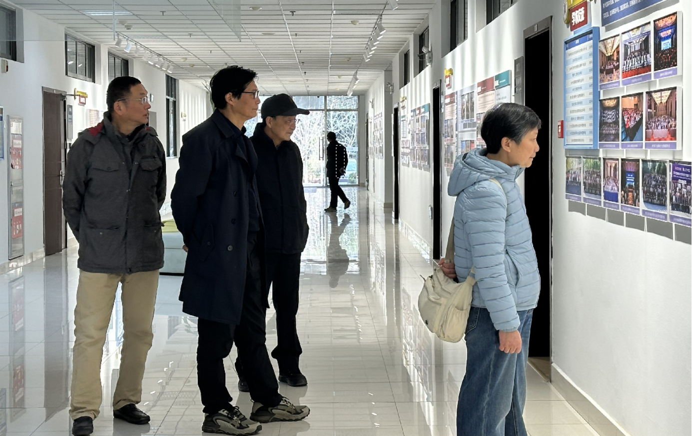 交流会前,退休教师们在学院领导陪同下,参观了2025年全新升级的学院文化墙。文化墙系统呈现了学院建院40年来的发展脉络与重要瞬间,以丰富的图文资料展现了学院在学科建设、人才培养、社会服务、国际合作与交流等方面取得的丰硕成果。老同志们缓缓移步,仔细端详,时而驻足回忆往事,时而交流感慨。一幕幕熟悉的场景,勾起了他们奋斗岁月的深切回忆,也让他们对学院日新月异的发展面貌倍感欣慰与自豪。